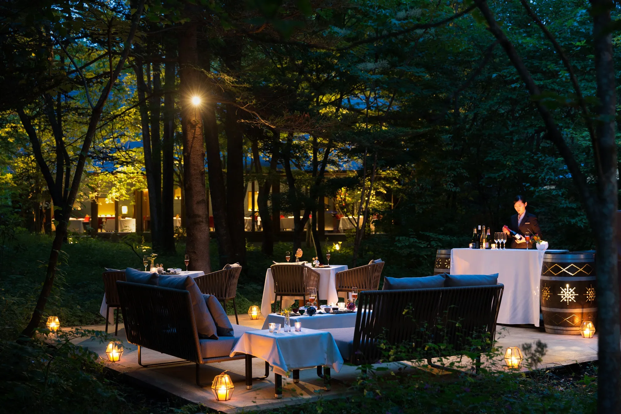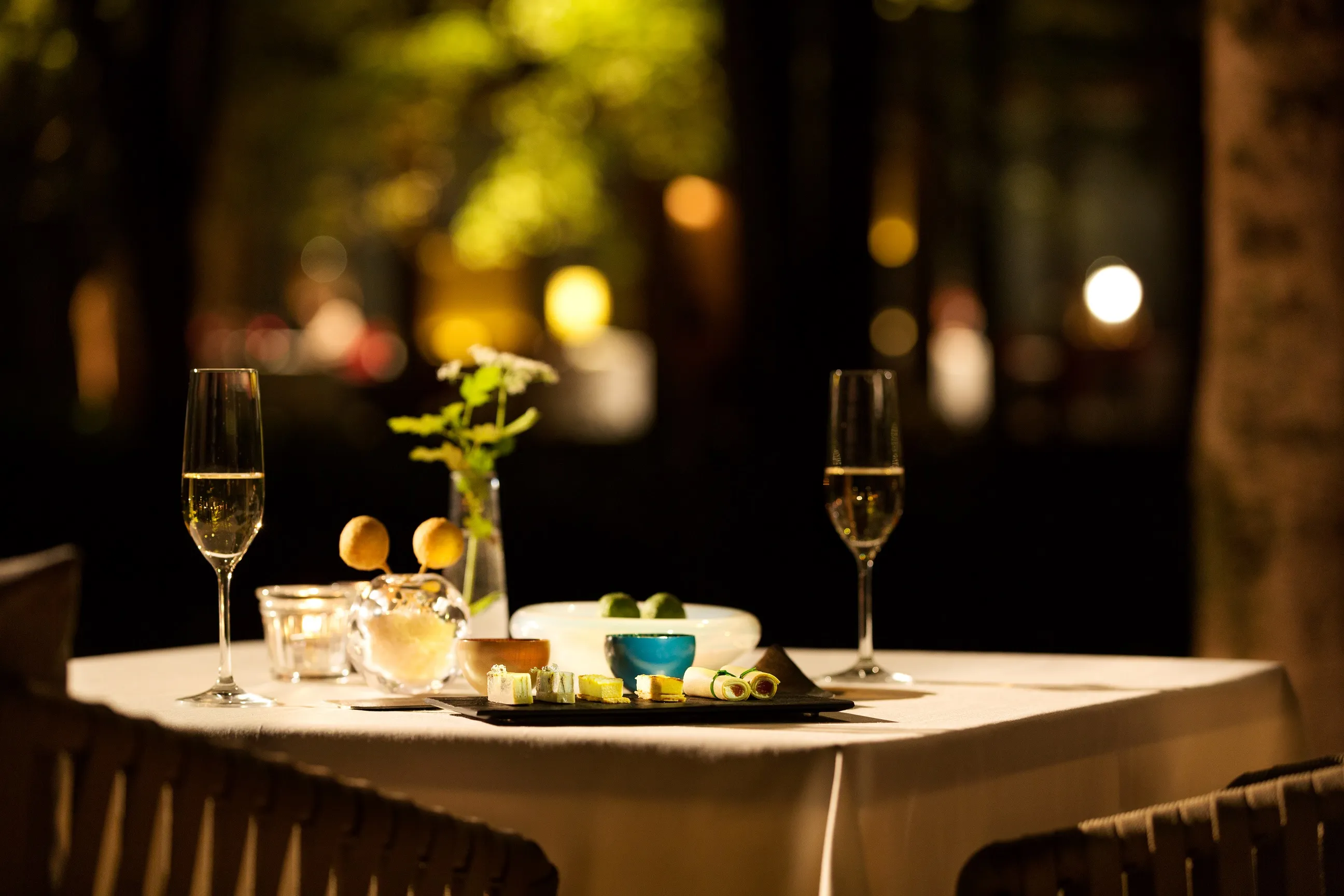 夕暮れの時刻に木々のなかで行われるアペロでは、シャンパンなどの食前酒とアミューズを提供します。森を抜ける風が肌にやさしく、涼風もごちそうになるアペロは、夏夜のディナーへの期待を高めます。
