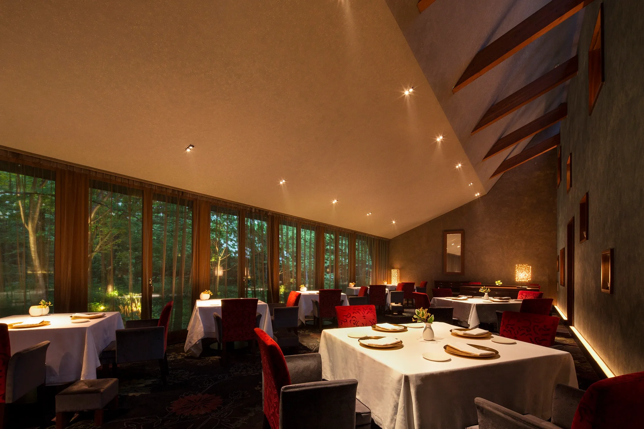 木立の中に佇む「軽井沢ホテルブレストンコート」のメインダイニング。清らかな水に恵まれた信州の食材を贅沢に使い、「水のジビエ」をコンセプトに、ここならではのフランス料理を追求しています。