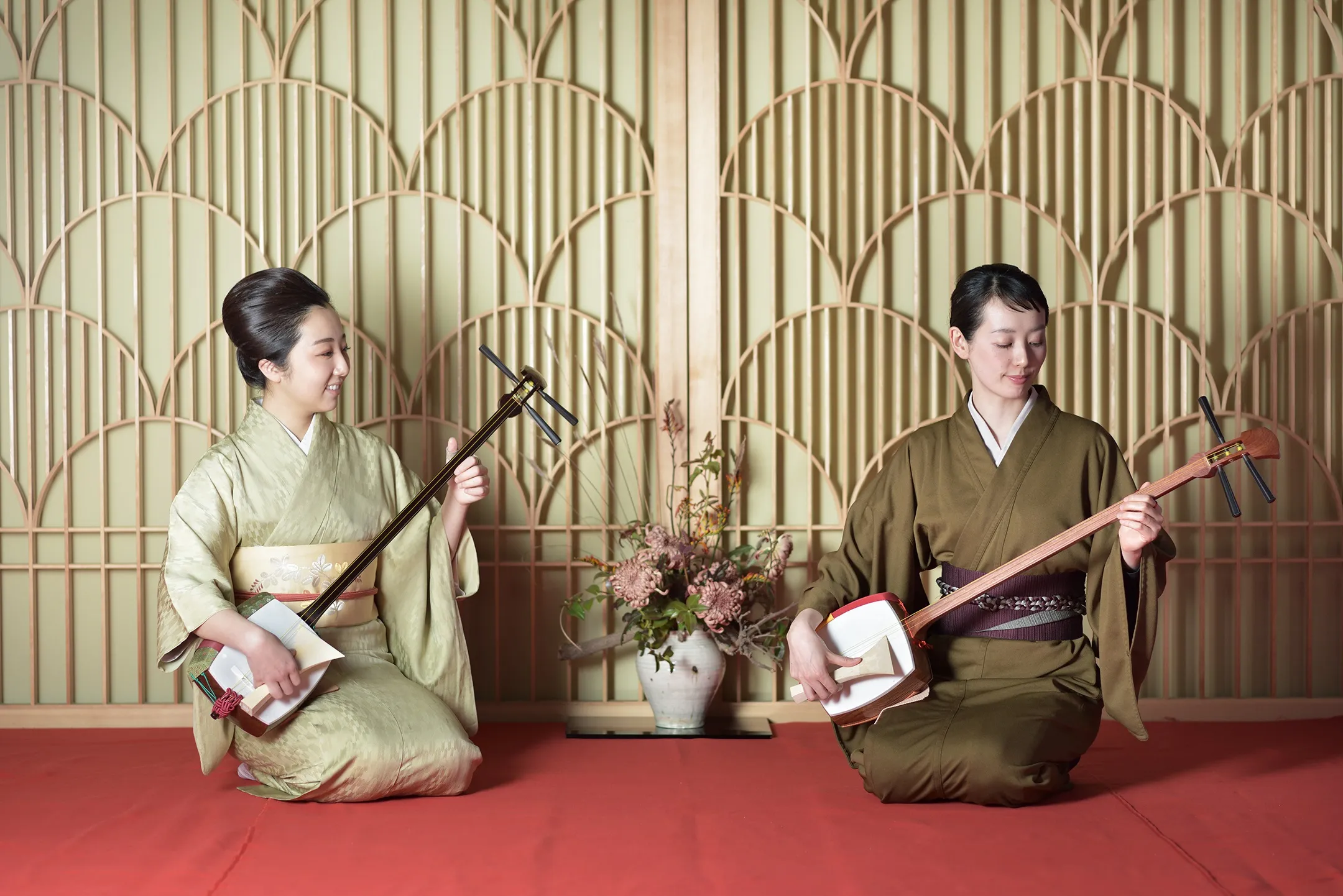 江戸時代、歌舞伎や浄瑠璃に使われる伴奏楽器の稽古は非常に人気があり、特に三味線は、手を返す動作や指の所作が女性らしい美しい仕草につながると言われ、女性の嗜みとして重要視されていました。江戸の町で発展した箏曲流派「山田流」の山田流箏曲萩岡派四世・萩岡松韻氏監修のお稽古では、初めて三味線に触れる方でも一曲弾けるようになることを目指します。