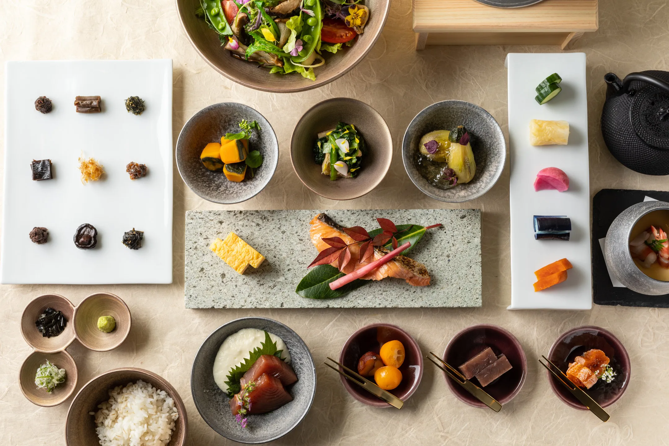 朝食は、かつて江戸近郊で栽培されていた伝統野菜である江戸野菜や、江戸で親しまれていた魚貝を使った「江戸美人御膳」を提供します。内藤南瓜や城南小松菜など、東京で栽培された野菜を使った小鉢やサラダ、鮭や鰤などの焼き魚、あさりやじゃこの佃煮など、滋味あふれる旬の江戸野菜と魚貝を味わうことで体の内面から美しくなることを目指します。