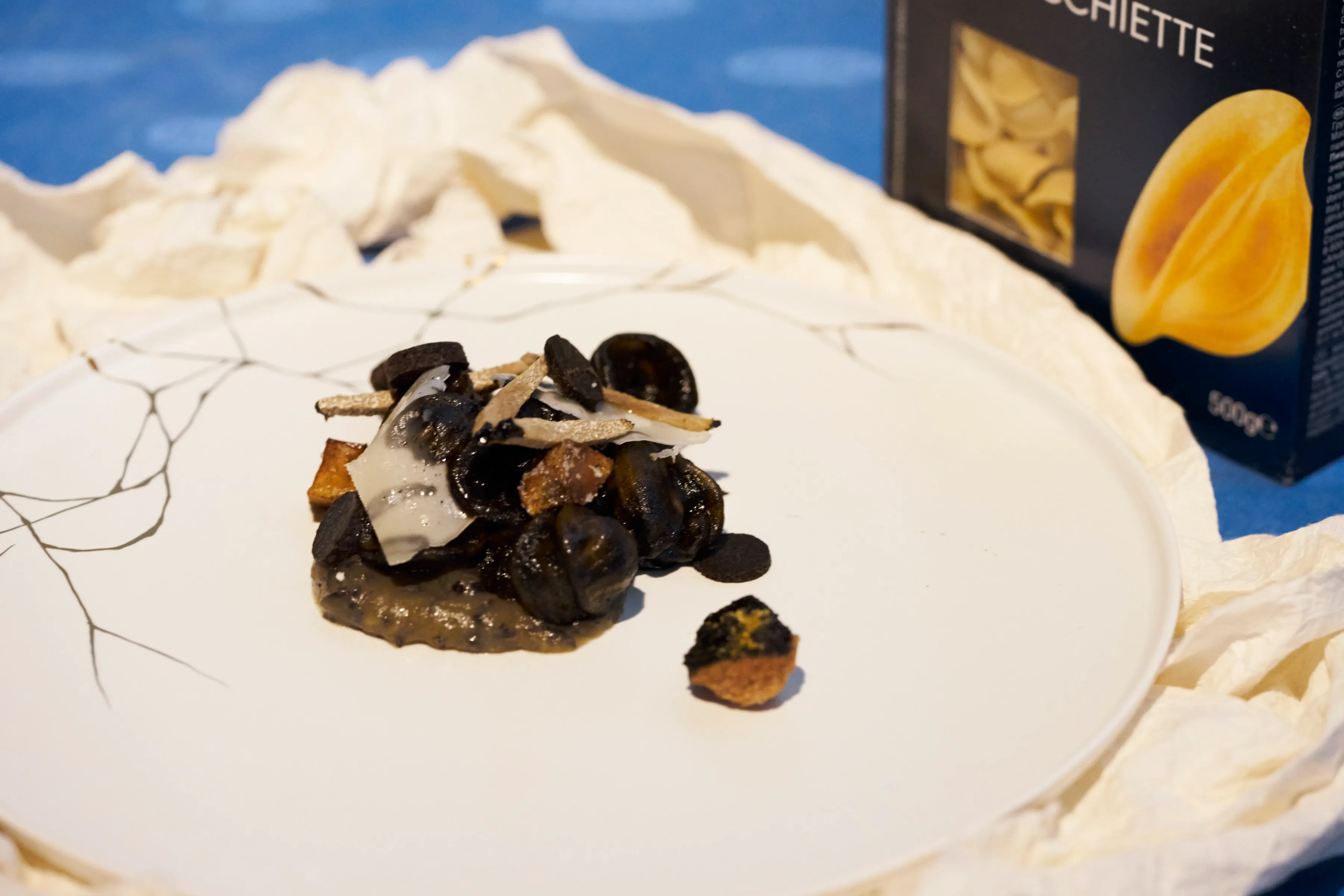 6月3日(月)に行われた日本予選・最終選考会では、書類選考を勝ち抜いた3名の若手シェフが出場し、考案したオリジナルパスタレシピで実技審査及び英語でプレゼンテーションを行いました。日本代表シェフに選ばれた弓削さんは、出身地佐賀県の有田焼の器の上に、同じく特産物であるイカと海苔を使ったラグーソースやブロード、またフランス・パリでの修行時代のスペシャリテから着想を得たアーティチョークと黒トリュフをつかい、耳たぶのような形のパスタ、バリラ オレキエッテ・プリエージに合わせた「Orecchiette ragu di calamaro con tartufo nero」を制限時間45分丁度で披露しました。PWCのために考え抜かれたレシピや調理パフォーマンスからは、ご自身の思い出の地パリで「今度は世界一を掴みたい」という強い想いがこめられていました。