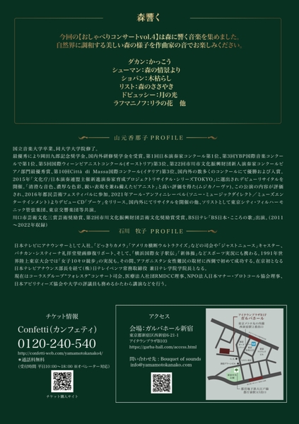 Bouquet of sounds主催、『ピアニスト山元香那子とアナウンサー石川牧子のおしゃべりコンサートvol.4』が2024年6月12日 (水)にガルバホール新宿(東京都新宿区西新宿6-21-1アイタウンプラザB103)にて開催されます。