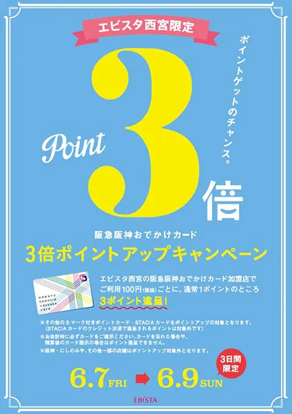 阪神西宮駅直結のエビスタ西宮では、2019年6月7日(金)~9日(日)の3日間、「阪急阪神おでかけカード3倍ポイントアップキャンペーン」を実施いたします。