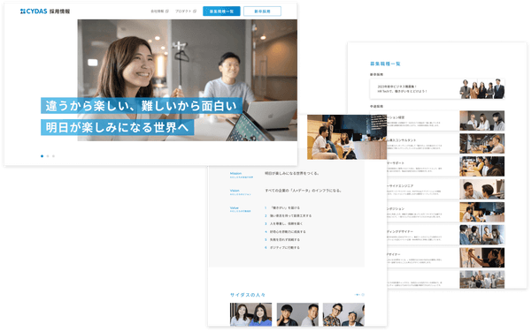 東京オフィス、沖縄オフィスの写真を多数使用したデザインと、サイダスでの働きがいを表現したキャッチコピーで、候補者の方に会社の魅力を認識していただけるようなサイトに仕上げています。