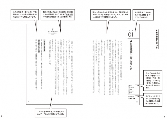 ②ネタが使える場面として、「朝礼」「スピーチ」「雑談」「プレゼン」「接待」を想定。各々ネタがどの場面に適するのがわかるように見出し周りに表示