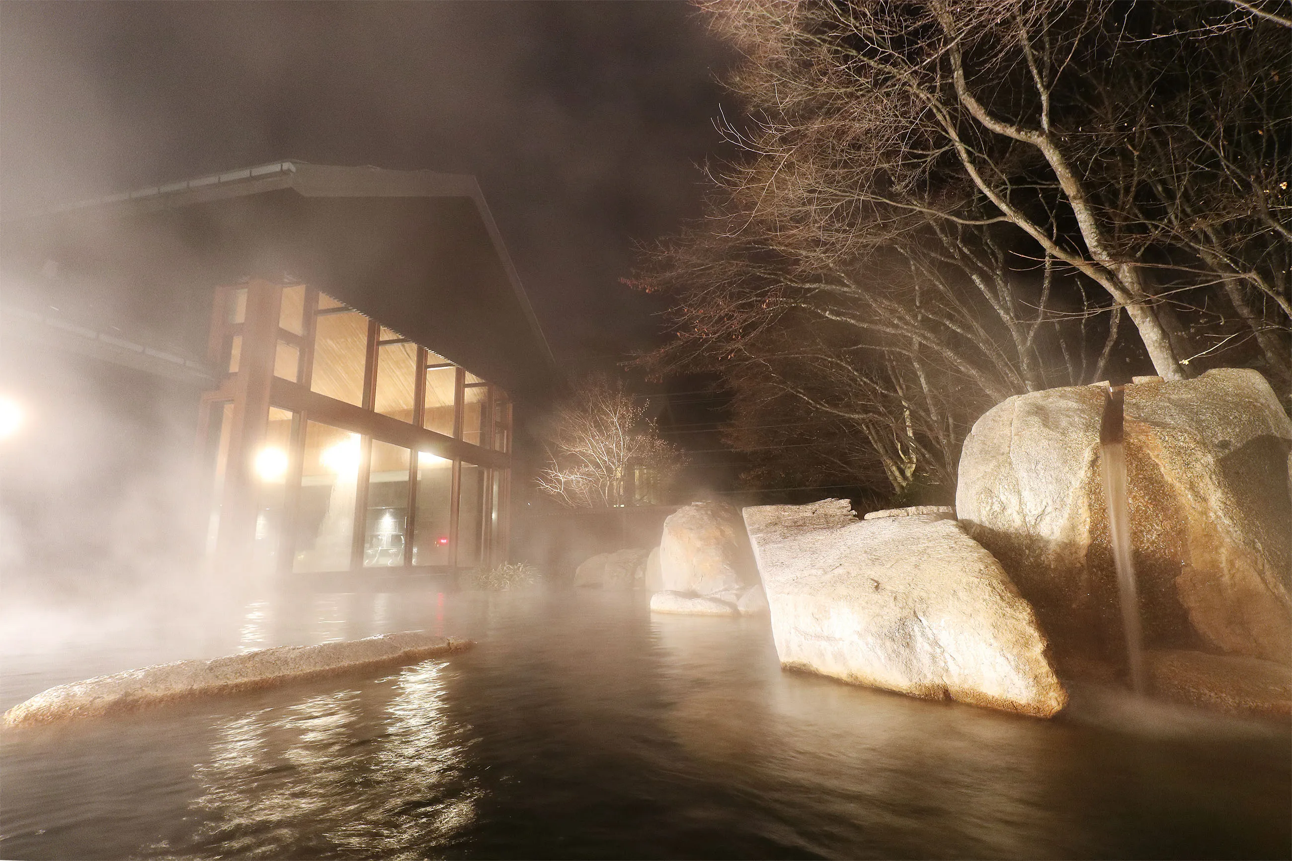 星野温泉 トンボの湯は、毎分400リットルの源泉をかけ流しています。窓が大きく広々とした内湯と自然の木々に囲まれた露天風呂があり、開放的な気持ちで入浴できます。月明かりの下、温泉に浸かり月光浴をすることで自律神経を調え、心も身体もリラックスします。