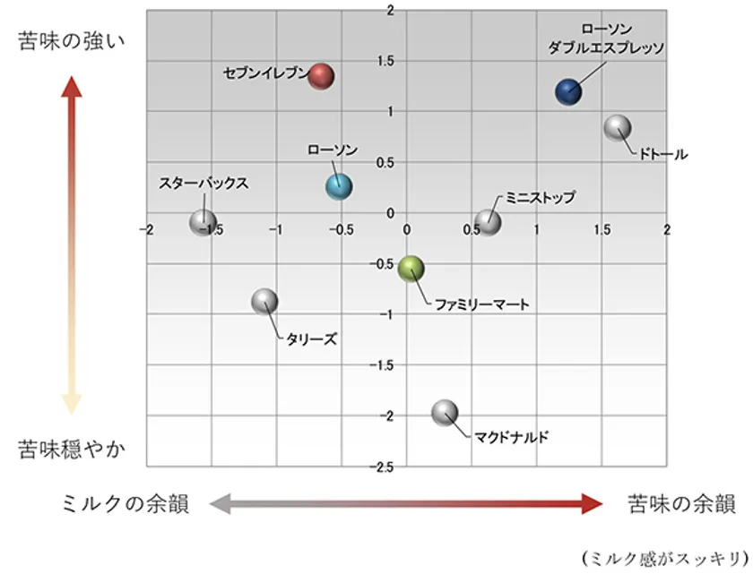 主要コーヒーチェーン、ファーストフード店およびコンビニエンスストア各社のカウンターコーヒー(アイスカフェラテ)の味わいを調査し、苦味やその余韻、ミルクの余韻などのバランスを図2に示した。ゼロ点はカフェラテ全測定平均値である。
