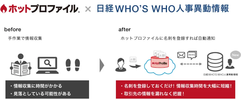 企業間競争が激化する現代において、企業が生き残るためには「営業力の強化」が必要です。そのためにも、お客様の動きをいち早く把握し、競合よりも早くアクションできることが重要となります。しかし、お客様の人事異動情報を知るには新聞やWebに掲載されている大量の情報から自身にとって必要な情報を探し出さなければならず大変な労力がかかります。せっかく探しても情報量が多いため見落とす可能性もあります。働き方改革が求められる時代にあって、このような情報収集は業務効率化とは相反する活動です。今回の連携では、名刺交換した人物の名刺を「ホットプロファイル」に登録するだけで、「日経WHO'S WHO人事異動情報」から該当の人物に関する人事異動情報を自動で受け取ることができるようになります。自分から調べに行くことなく、関係する人事異動情報だけを把握することができるため、業務効率化と営業強化を強力に後押しします。