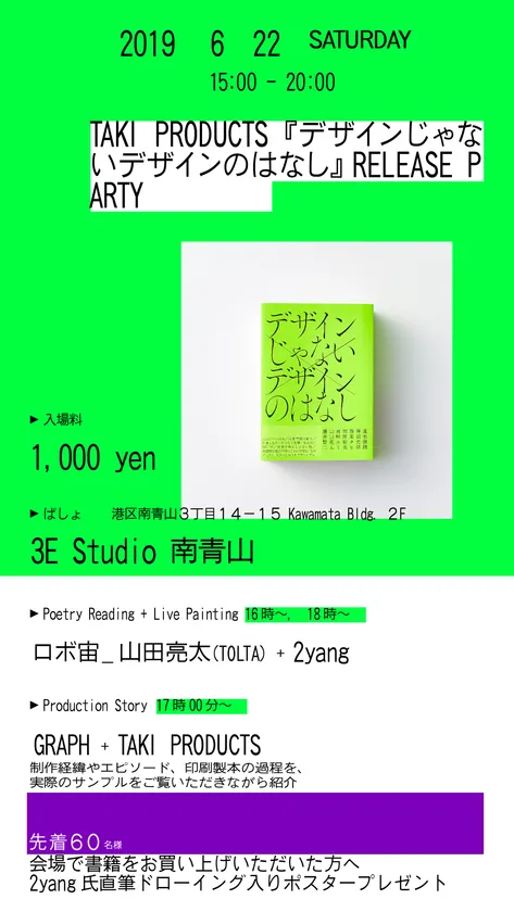 株式会社たき工房(所在地:東京都中央区、代表取締役社長:湯浅洋平)は、“ヒトに「伝えたくなる」をつくる”をテーマに活動するプロダクトデザインプロジェクトTAKI PRODUCTSにおける書籍『デザインじゃない デザインのはなし』の発売を記念して、2019年6月22日(土)、3E STUDIO南青山でリリースパーティーを開催いたします。