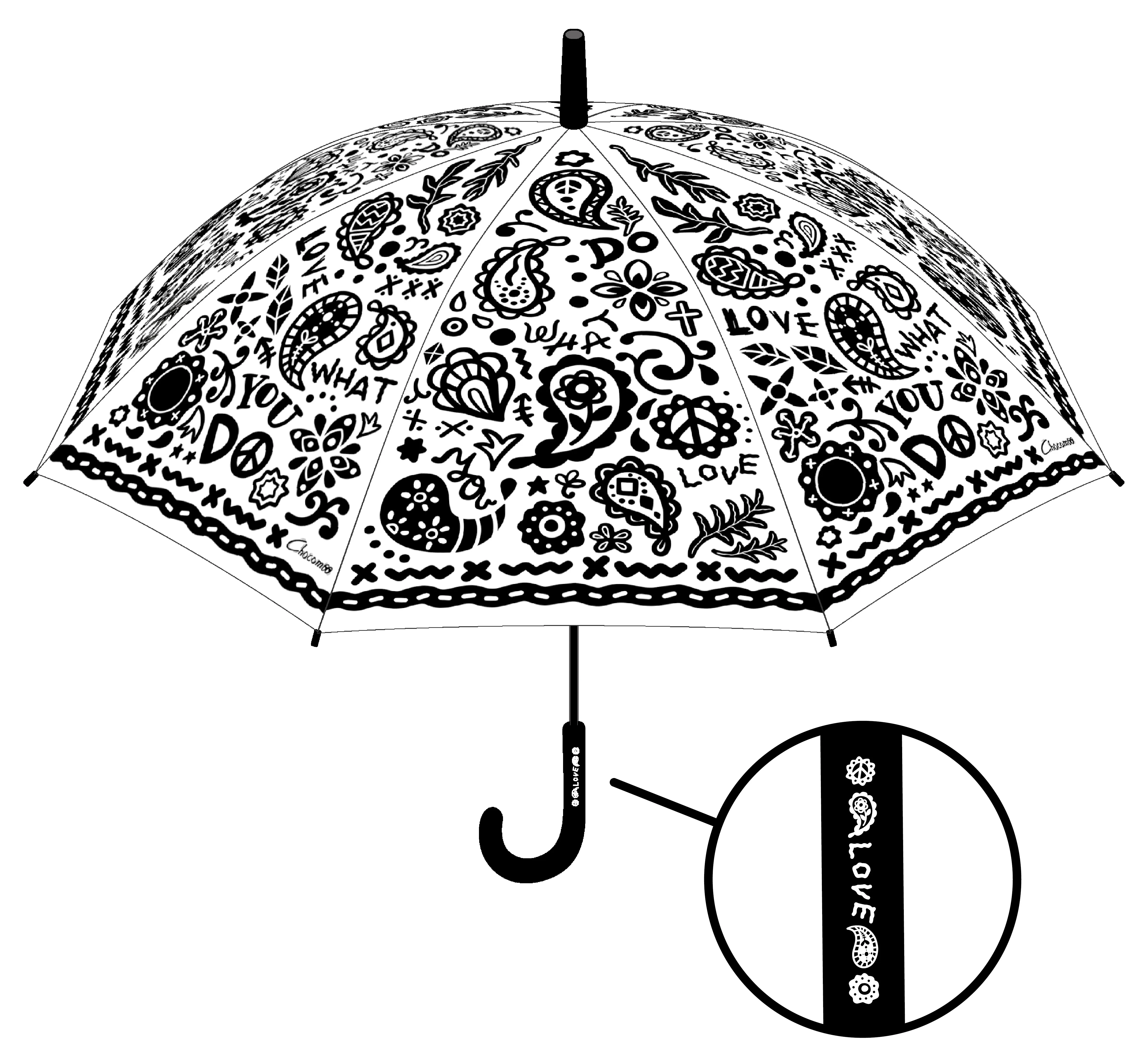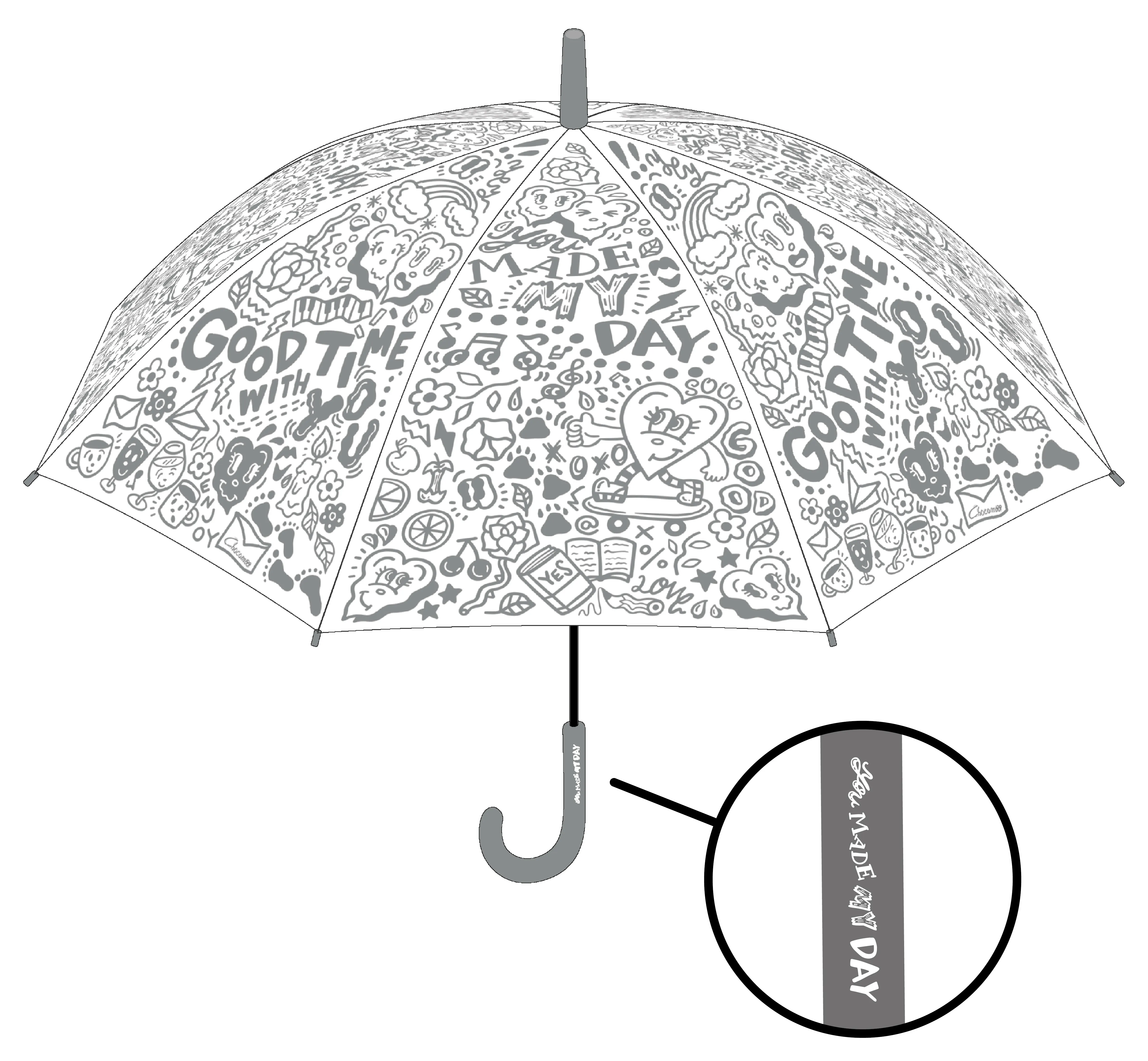 様々な取り組みで活動の場を広げている、モノトーンで描く作品が人気のイラストレーター”Chocomoo(チョコムー)”がデザインした3種のビニール傘がファミリーマートで発売します。いつものキャラクターたちが雨でも楽しんでいるイメージで描かれた「GOOD TIME」。Chocomooが描き続けるハートをモチーフにしたキャラクター”Don’t Touchくん”が雨の中ダンスをしているイメージの「DANCE」。モノクロのペイズリーモチーフの中にポジティブなメッセージが込められた「LOVE」。今年の梅雨時期にぜひ手に入れていただきたいアイテムに仕上がりました。