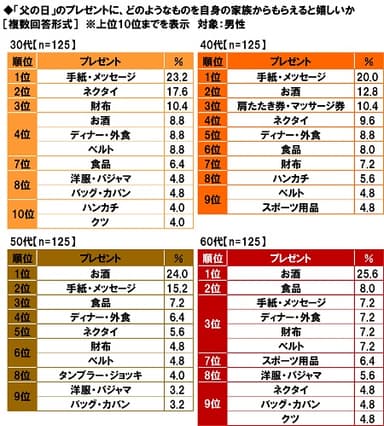 ◆父の日にもらえると嬉しいもの 30・40代パパは「手紙・メッセージ」、50・60代パパは「お酒」
