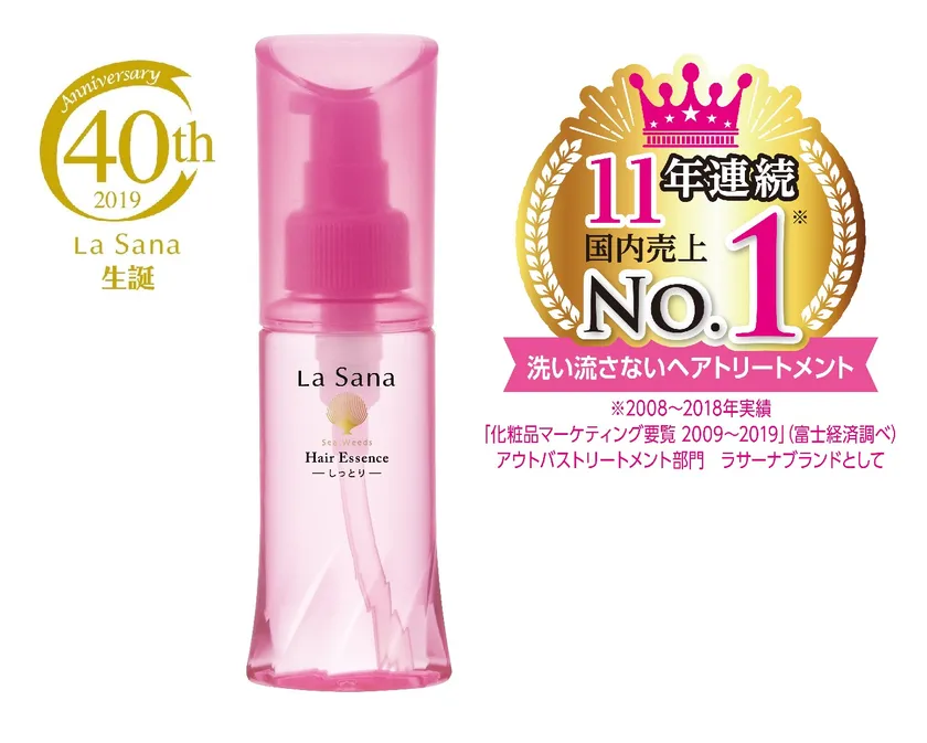 1998年、オイルタイプの洗い流さないヘアトリートメント「ラサーナ 海藻 ヘア エッセンス しっとり」を発売以来、高い補修力とベタつかない使用感が人気を呼び、その効果は口コミで広がり、本日まで高いご支持をいただいております。その後2008年に、剤形の異なる朝用アウトバス商品2品を投入。好調な売れ行きにより、同年、洗い流さないトリートメント市場のメーカー・ブランドシェアで、初のNO.1に輝きました。2012年には、髪にハリ・コシを与える「ラサーナ 海藻 ボリュームアップ ヘア エッセンス」、2013年には髪の摩擦に着目した「ラサーナ 海藻 ヘア エッセンス さらさら」を発売し、オイルタイプの市場領域を広くカバーすることに成功いたしました。さらに2019年6月には熱の力で髪型を長時間キープする「ラサーナ 海藻 ヘア エッセンス ヒートメモリー」を数量限定で新発売。ダメージ補修機能とスタイリング機能を1本に詰め込み、コテ・アイロンを使用したスタイリングが定番化している若年層の獲得を図り、ブランド認知の更なる拡大を目指します。