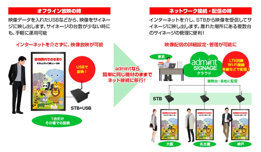 本サービスにより、デジタルサイネージの導入検討にあたり、設置数が少ないうちはオフラインサイネージとして運用し、設置台数が増えた際に、同じ機材のまま、複数台を一括管理・ネット配信をすることができる「admint SIGNAGE」へ容易に移行いただけます。