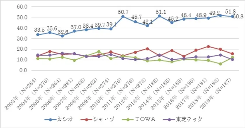 単独利用の電子レジスターは調査を開始した2003年以来、「カシオ」が17年連続でトップを維持しています。