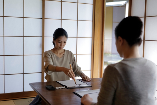 清水寺での書き初めの前日には、冬の静かな星のや京都で書道家の指導のもと、書のプライベートレッスンを行います。レッスンでは、最初に15分ほどかけて墨の香りがたつまでゆっくりと墨をすります。筆の持ち方や姿勢などを習い、基本の「止め」や「払い」の練習をした後は、清水寺で書く漢字一文字の練習です。集中してゆっくりと同じ動作を繰り返すことで、落ち着いて本番を迎えることができます。