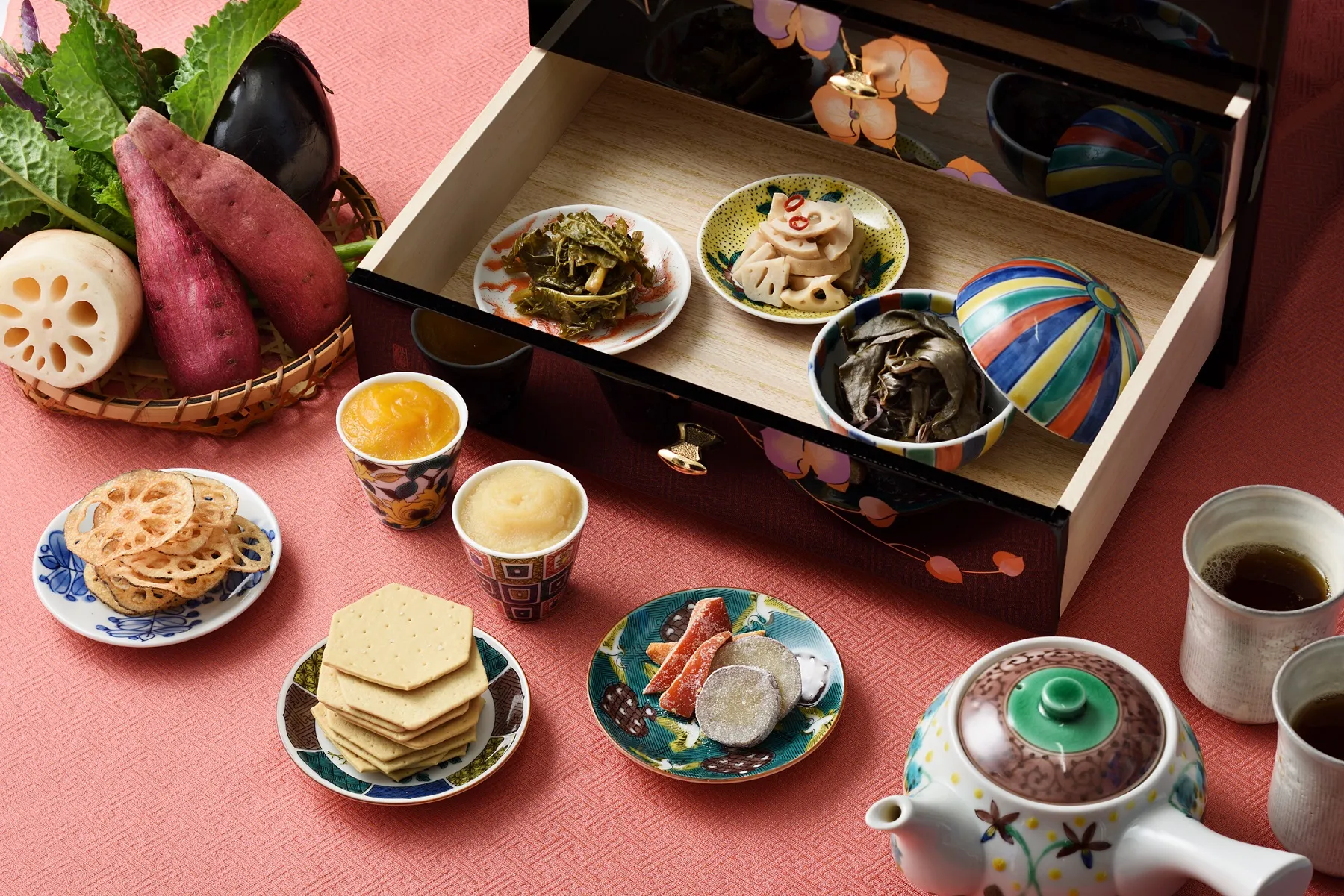 界 加賀では、2019年9月1日~11月30日まで、秋野菜を使用したお菓子やおつまみを加賀伝統の九谷焼の器に盛り付け、オリジナルの山中塗の箱に入れて提供します。加賀藩の時代から親しまれている秋が旬の野菜、かぼちゃ・れんこん・さつまいもを使った蜜漬けやチップスなどの7品を、緑・紫・紺青・黄・赤の五色の絵の具で描いた鮮やかな九谷焼の器に盛り付けました。渋みが少なく芳ばしい香りが特徴の加賀棒茶と共に、客室で和のテイストのアフタヌーンティーを楽しめます。九谷焼や山中漆器といった加賀の華やかな伝統に触れながら、加賀の地で親しまれてきた秋野菜を味わうことができます。