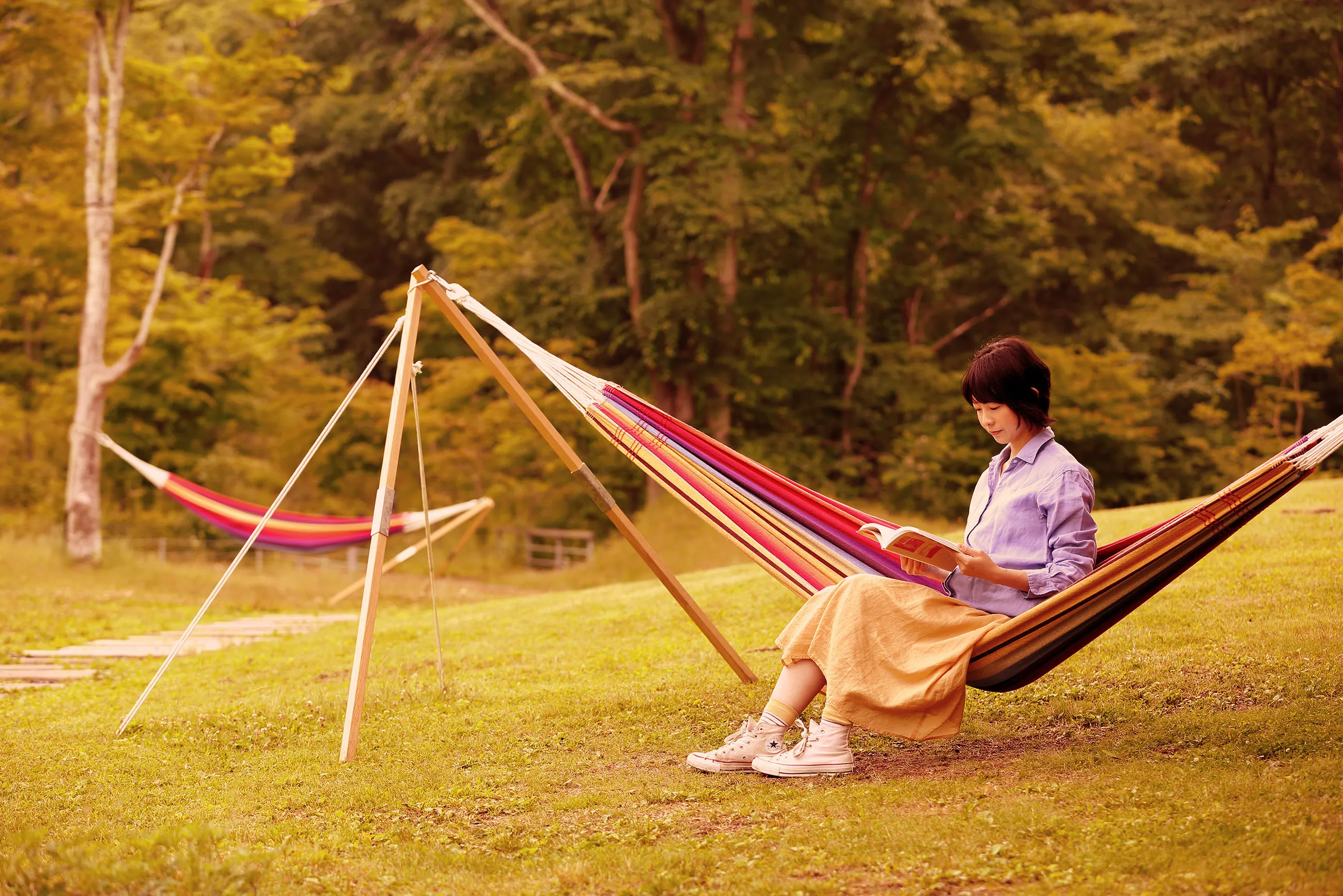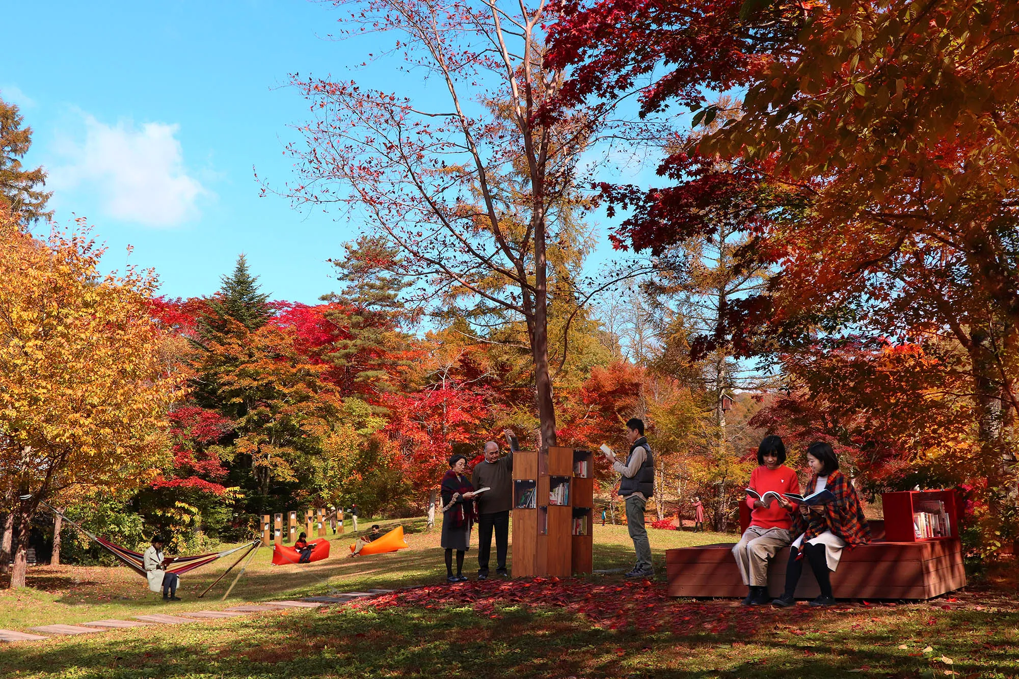 本棚は、景色の中に溶け込む様に、ゆるやかな曲線を描くカラマツの丘の地形に沿って並びます。紅葉色のクッションとハンモックで、誰でも自由に思い思いのスタイルで読書を満喫できます。