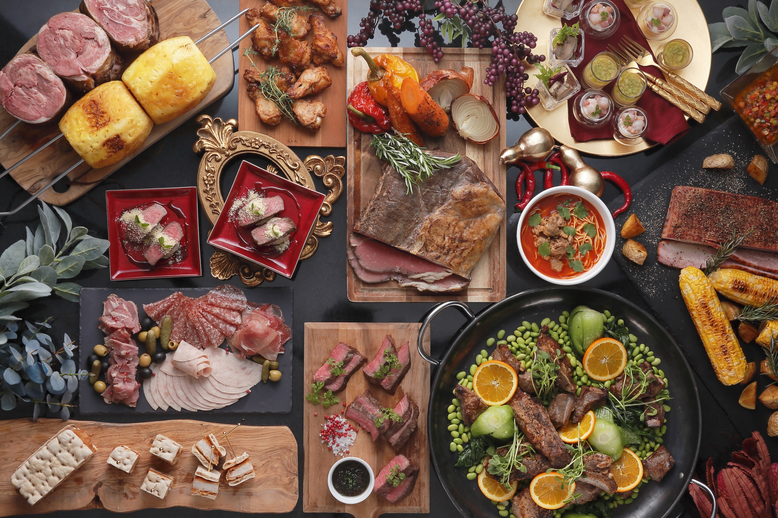 ジューシーな肉料理がバラエティ豊かにそろう本企画では、目の前でカッティングする“ローストビーフ”やお好みのソースで味わう“サーロインステーキ”、“スペアリブ”など人気の肉料理をはじめ、ディナー限定で“シュラスコ”や“牛肉のしゃぶしゃぶ”、トリュフ風味のリゾットに牛肉、フォアグラパウダーをあわせたシェフのスペシャリテも登場。