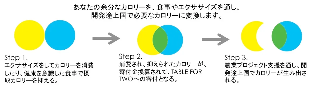 ※: カロリーオフセットプログラムとは、先進国の余分なカロリーを開発途上国で必要なカロリーに変換する日本初のプログラムです。健康を意識してカロリーを抑えている商品や、体を動かすことでカロリーを消費できる商品・サービス、およびイベント企画をお客さまが購入することで、カロリーをオフセット(「差し引き勘定」「埋め合わせ」)でき、売上の一部が寄付金となります。寄付金は、開発途上国での菜園づくりを通じて農業生産向上の支援やインフラ整備に利用され、自発的にカロリーを生み出すための支援に充てられます。http://jp.tablefor2.org/calorieoffset/