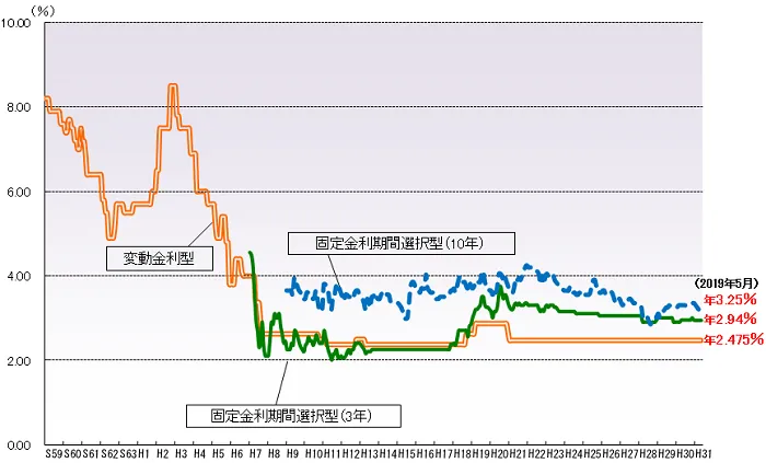 ※ 主要都市銀行のHP等により集計した金利(中央値)を掲載。なお、変動金利は昭和59年以降、固定金利期間選択型(3年)の金利は平成7年以降、固定金利期間選択型(10年)の金利は平成9年以降のデータを掲載。
