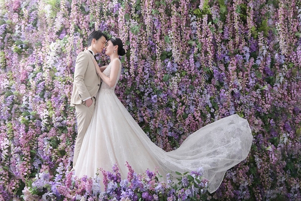 たくさんのお花が壁一面に花開く、フラワーウォールスタジオ。スタジオの中でお花畑のような撮影を楽しめます。「ロケ撮影だと日程の都合がつけにくい」「暑い時期は体調が心配」といったおふたりにもおすすめです。