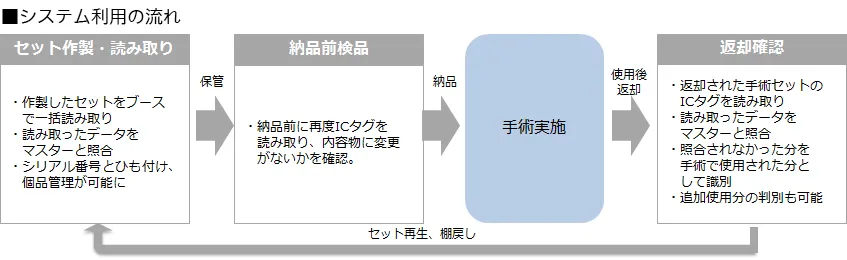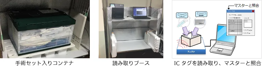 ICタグの一括読み取り機能を活用した本システムの導入により、手術で使用するガウンや縫合キット、シリンジ容器などの医療材料の検品や出荷、返却確認の業務の大幅な効率化を実現しており、作業時間を約1/20へと短縮しています。また、本システムは既存の院内管理システムとの容易な連携が可能で、トレーサビリティー管理や医療材料のマスター照合による誤出荷防止、数量欠品防止などの、人手によるミスの撲滅につなげることができます。