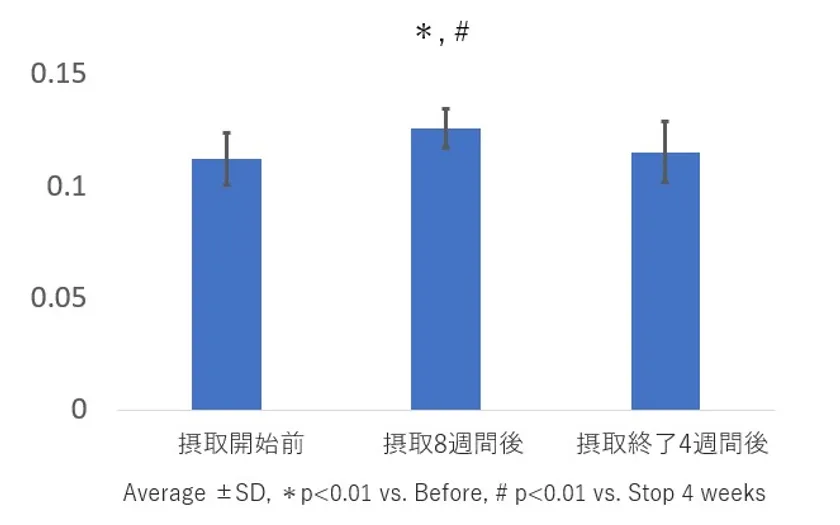 ・頭皮測定機A-ONE Tabの測定結果から、毛根部近くの毛髪が、摂取前0.112±0.01mmに比べて、摂取後0.126±0.01mmは有意に太くなったことが確認された。