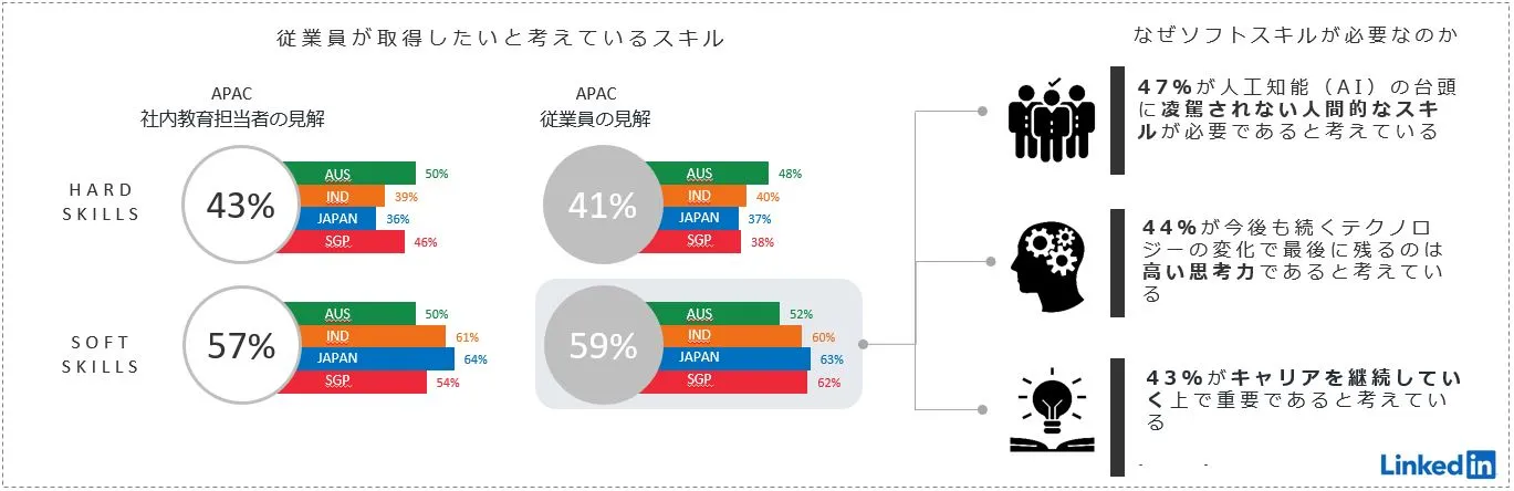 リンクトイン 「Future of Skills 2019」今、社会人が最も取得したいスキルに関する調査は、ACA Researchに委託し、2019年3/13から4/15の間に、社内教育の状況に掘り下げた視点を提供する目的で、アジア太平洋全域の従業員と社内教育担当者たちを対象に行われました。