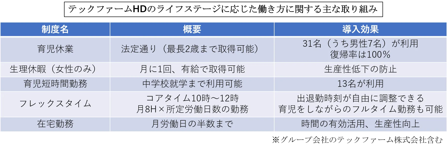 そこでテックファームHDは、心身をゆっくりと休め妊娠しやすいからだづくりに時間をかけて取り組めるように、最長90日間の妊活休暇を導入します。育児休業や時短勤務といった出産後のサポート制度とあわせ、さまざまなライフステージの社員を性別や年齢、未/既婚に関係なく支援していきます。