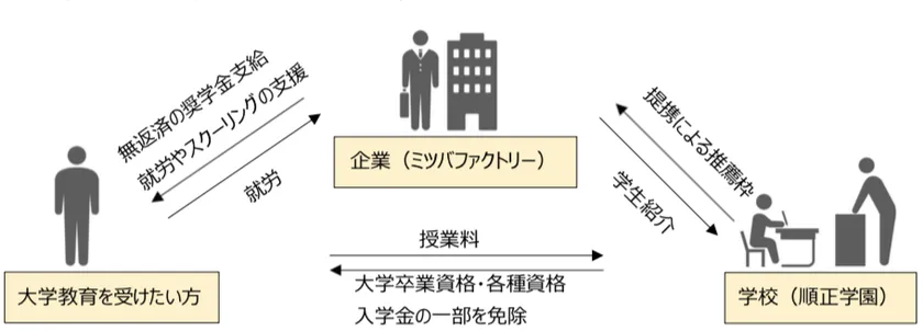 リラクゼーション事業や児童発達支援・放課後等デイサービス事業を展開する、株式会社ミツバファクトリー(本社:岡山県岡山市、代表取締役:江見 慎之介、以下 当社)は、学校法人順正学園(岡山県岡山市、理事長:加計 美也子)と協力し、学力や経済力を理由に大学へ進むことを諦めた方の大学進学をサポートする採用制度をこの度導入いたしました。この制度により、一度大学進学を諦めた高校生や社会人も、当社にて就労することを条件に、「当社推薦枠」「入学金の全額免除」「授業料の半額を無返済の奨学金として支給」などのサポートをうけながら、大学卒業資格を取得することができます。