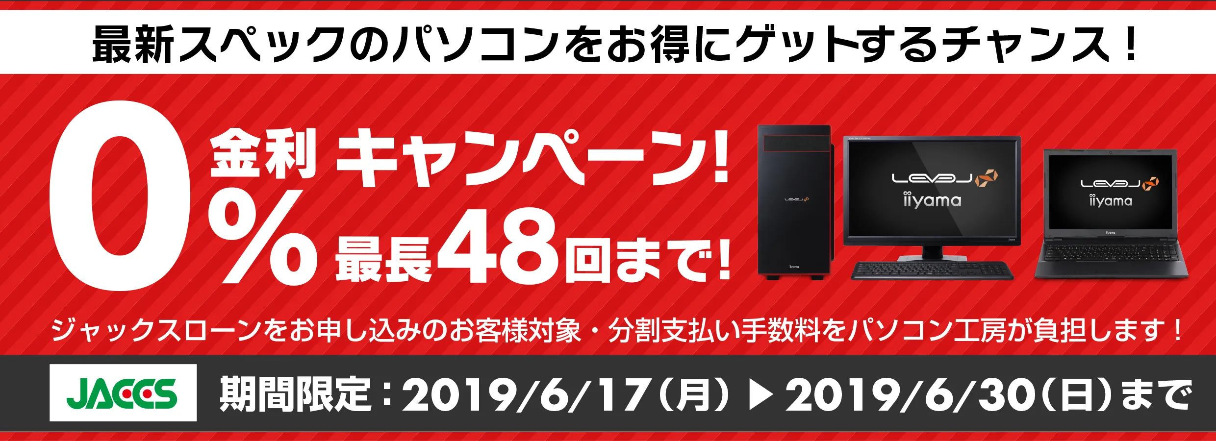 パソコン工房・グッドウィルを運営する株式会社ユニットコム(代表取締役:端田 泰三、本社:大阪市浪速区)は、パソコン工房Webサイトおよび全国のパソコン工房・グッドウィル各店舗にて、ジャックスローンをご利用の場合、分割支払い金利手数料が最長48回まで無料になる『ショッピングローン0%金利キャンペーン』を2019年6月17日(月)より開始しました。