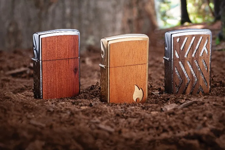 日本では現在、3種類のユニークなデザインのコレクションを販売しています。2019年中には、さらにいくつかのアイテムがコレクションに加わる予定です。第一弾のコレクションには、両面にシダーのエンブレムを貼り付けた「ブラッシュドクローム シーダーエンブレム」、ジッポーの炎のデザインを刻印した天然のマホガニーエンブレムを貼り付けた「ブラッシュドブラス ウッドチャック マホガニーエンブレム ファイア」、天然のウォールナットをレーザーカットで仕上げた「へリングボーンスウィープ ウォールナットエンブレム」を用意しています。いずれも全世界のFSC認証地域から責任をもって調達した木材を使用しています。