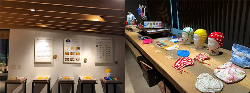 本展示会では、水泳帽子ができるまでの工程の説明、これまでの水泳帽子の歴史(実物展示)、赤ちゃんのおむつカバーから派生したさまざまな商品の展示をしています。
