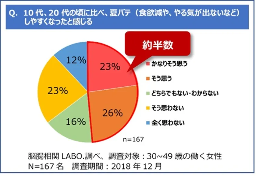 脳腸相関LABO.は、30~40代の働く女性167名を対象に「夏バテしやすくなったと感じるかどうか」という調査を実施いたしました。