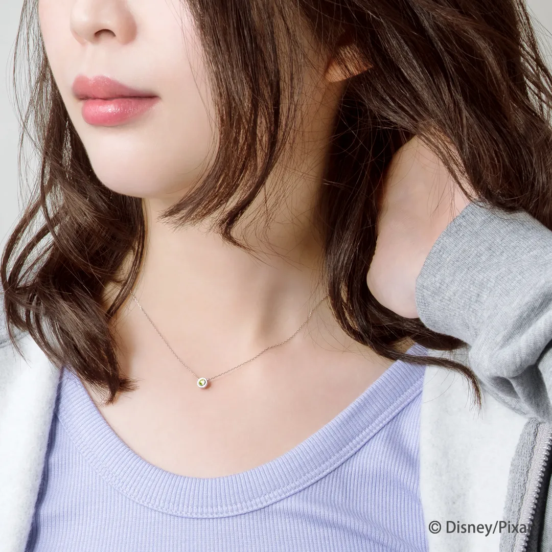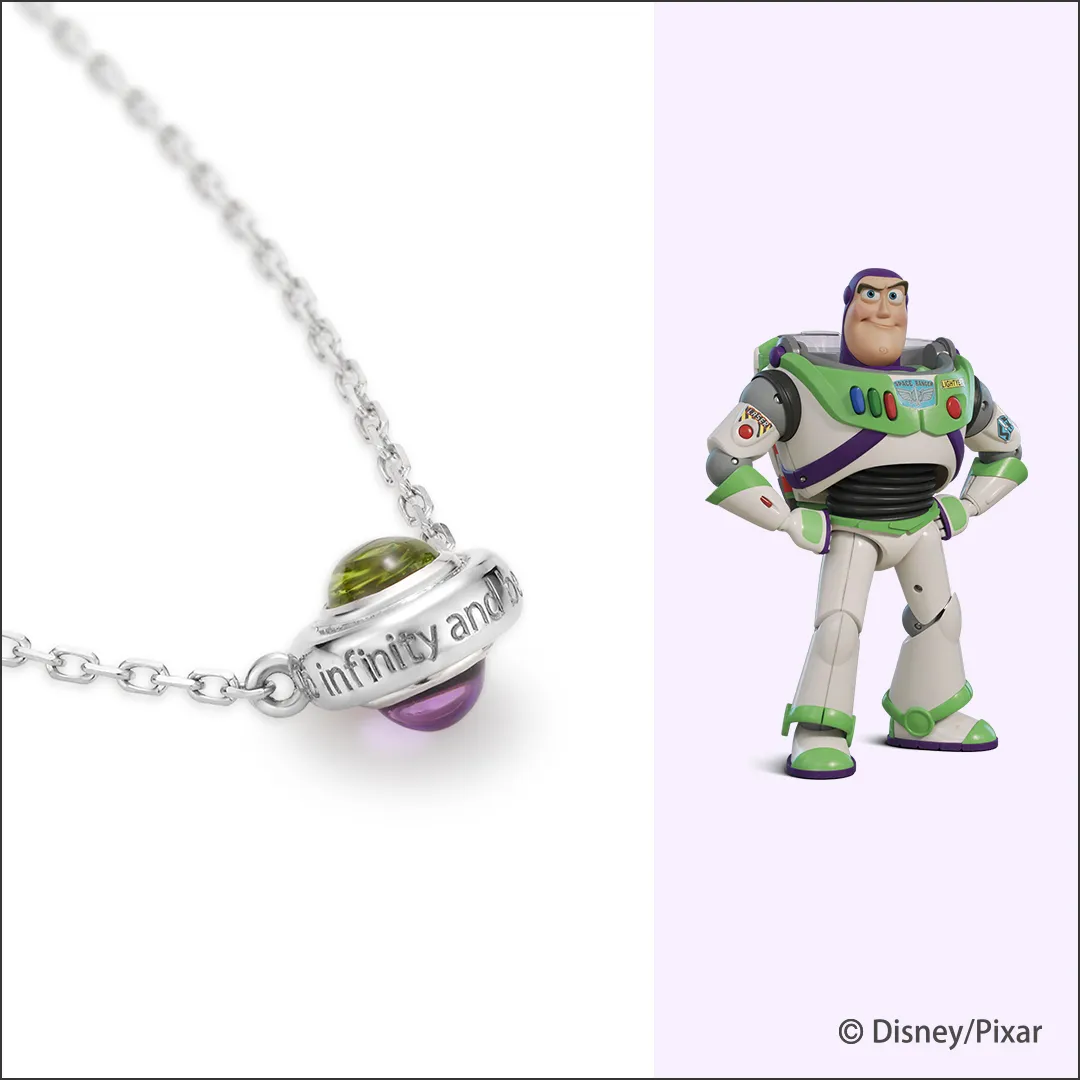 バズ・ライトイヤーのボディカラーをイメージしたネックレス。表にはペリドット、裏にはアメシストをセットしたリバーシブル仕様です。側面には決めセリフの「To Infinity and Beyond!(無限のかなたへ、さあ行くぞ!)」を刻んで。つるんと丸い、カボションカットのカラーストーンが程よい存在感を演出。「今日はどっちのカラーにしよう…?」その日の気分に合わせてスタイリングを楽しんで。