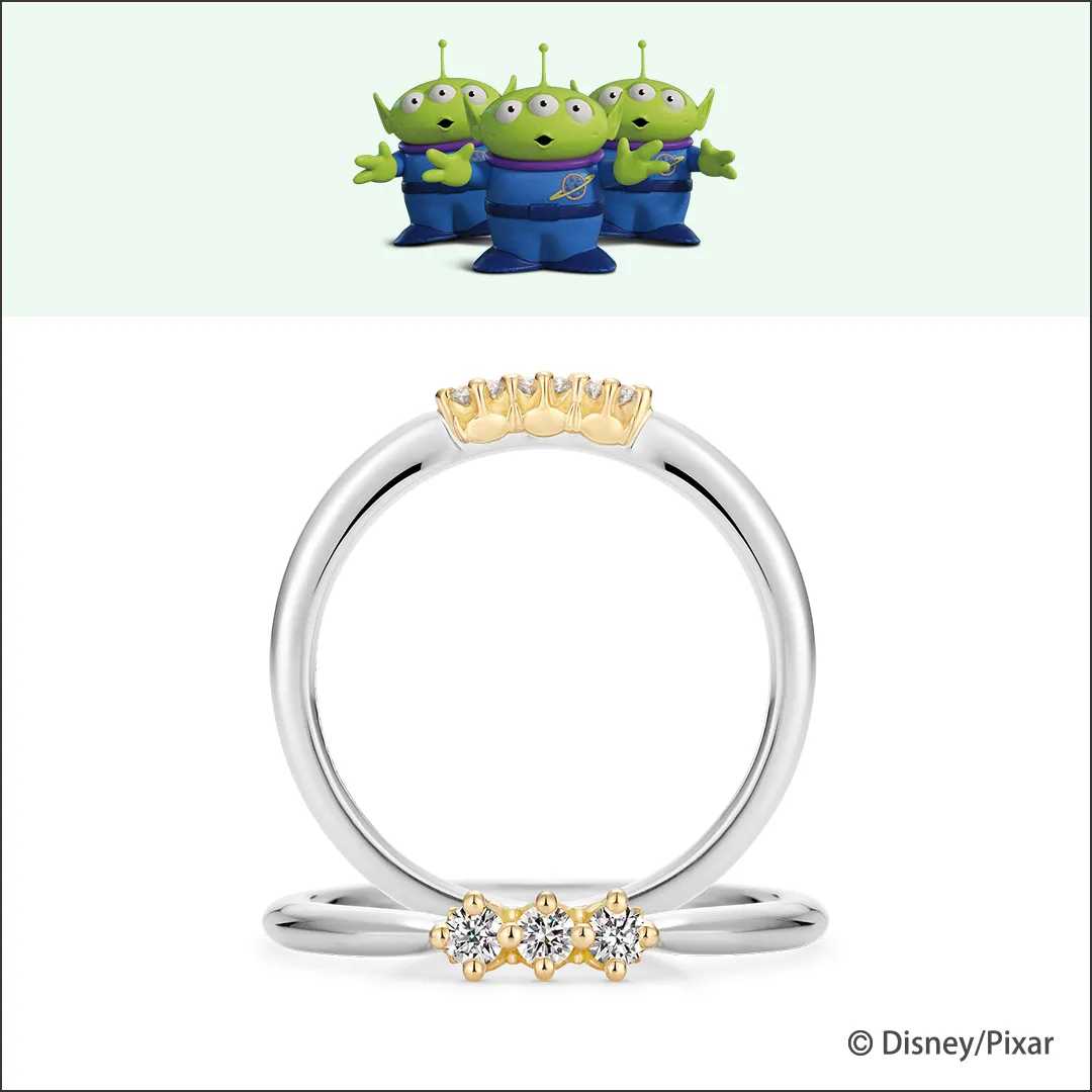 仲良く並んだエイリアンのシルエットをリングに。ゴールドカラーのエイリアンが、両面にデザインされています。触覚の部分が、ダイヤモンドを留める爪になっているのも面白いポイント。まるでダイヤモンドをしっかりと守っているよう。3人ピッタリとくっつく様子が何ともいえない可愛さ。正面から見ると、ダイヤモンドが連なるシンプルなリング。側面とのギャップに遊び心を感じるデザインです。