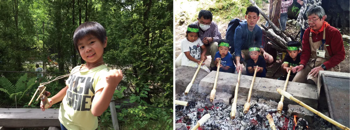 焚火でパン焼き、五平餅を作ろう、飯ごう炊さん、焼きもろこしを作ろう、ソーセージパンを作ろう、じゃがいもを使ったクッキング、自然探検ツアーなど