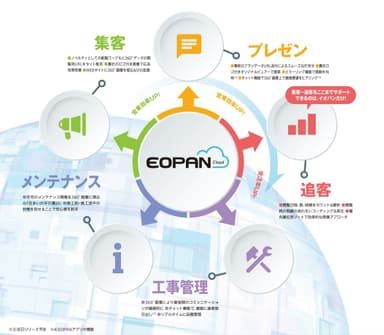 今までのようなデータの送信やその場での情報提供ではなく、「EOPAN Cloud」サービスを利用することで、クラウドへアップロードしたデータを、時と場所を問わず、お施主様ご自身がスマートフォンなどの端末から直接閲覧する形が実現します。
