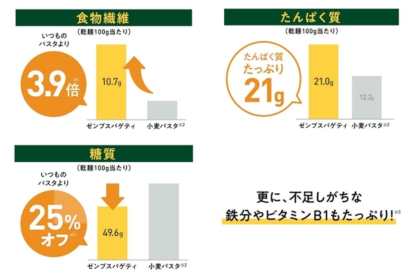 うす皮まで余すことなく黄えんどう豆を使うことで、パスタで食物繊維やたんぱく質をたっぷりとることができます。更に、不足しがちな鉄分やビタミンB1も豊富※3で、小麦パスタ※2と比べて糖質25%オフ※1と嬉しいことだらけ。