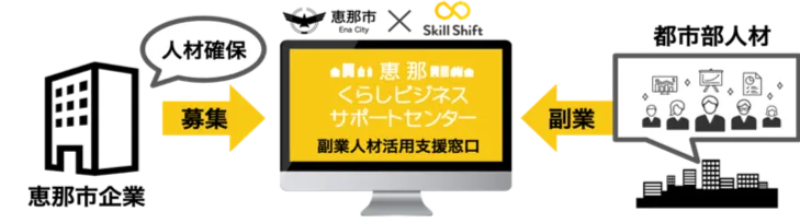 これにより、全国初となる副業マッチング支援窓口「『SkillShift』恵那受付窓口」を開設。市内企業と副業人材のマッチング支援を開始いたします。