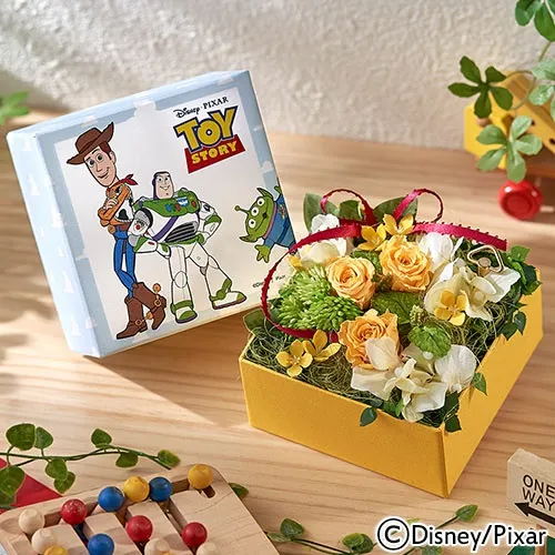 『トイ・ストーリー』の楽しくて感動的な物語をオルゴールのメロディにのせてデザインしました。オリジナルデザインのボックスに、物語をイメージした個性的な花をアレンジ。目で見て、耳で聞いて楽しいオルゴールフラワーです。