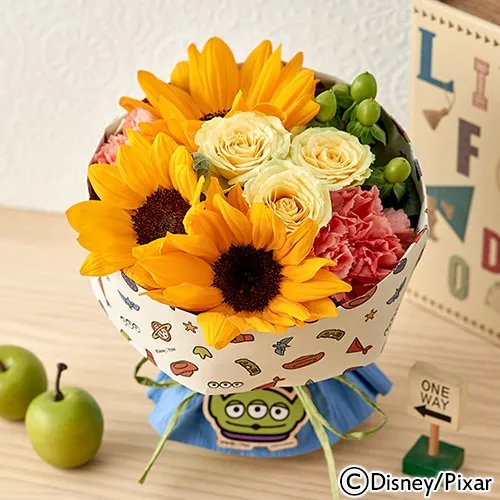 『トイ・ストーリー』の明るい色使いをデザインした、ポップでかわいいブーケ。太陽のような元気いっぱいのひまわりは、お部屋を華やかに彩ります。そのまま飾っていただけるスタンディングタイプのブーケで、エイリアンのウッドプレートはお花が終わった後、チャームとしてもお使いいただけます。