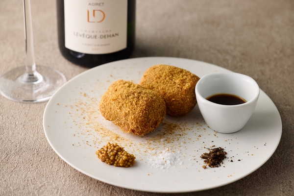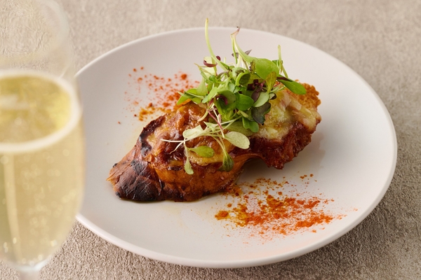 AWATAMAオニオンスープを使った卵液に漬けて焼いた、ふわふわ食感のバゲット。さらに、チーズと自家製ミートソースを和えたずわい蟹をのせて焼き上げられ、AWATAMAオニオンスープの甘味が引き立つ贅沢な味わいに仕上がっている。