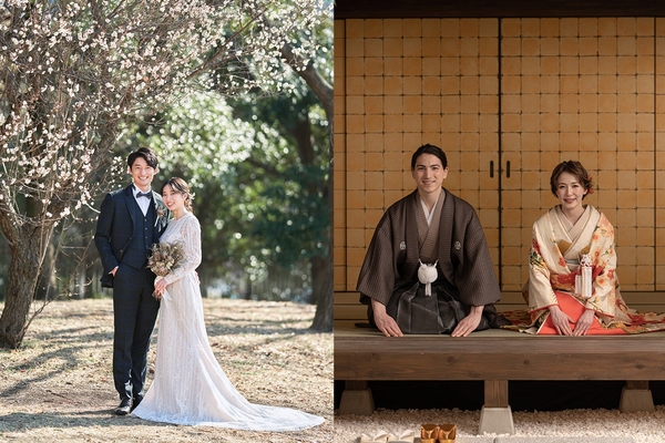 洋装はロケーション撮影で、和装は本格的な茶室スタジオで。洋装と和装どちらも叶うお得なセットプラン。