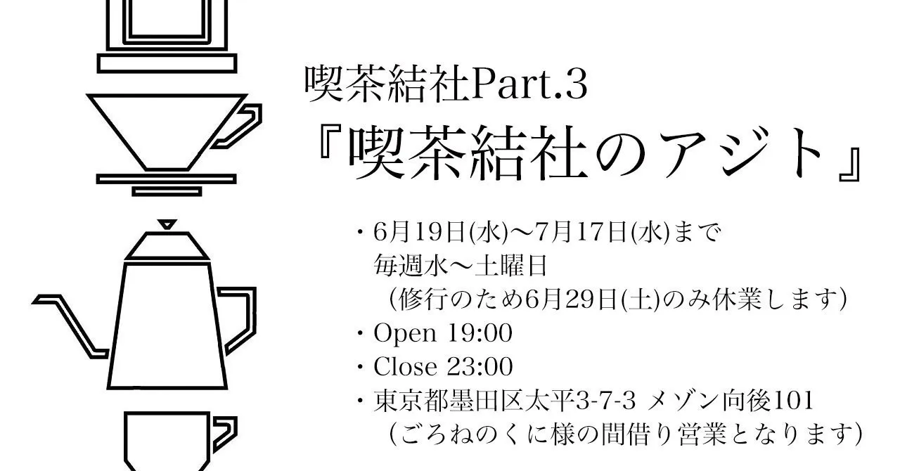 『「喫茶」の定義であそぶ』をモットーに、毎回様々なコンセプトで期間限定カフェを開業している喫茶結社の錦糸町初店舗です。『喫茶結社のアジト』と銘打った今回は、「1日の終わりに立ち寄るカフェ」というコンセプト。国内やインドネシアのカフェでも活躍した店主のハンドドリップのコーヒーはもとより、〆のパフェや〆の雑炊などを取り揃えております。昼間は「ごろねのくに」として、お子様が裸足で楽しめる遊び場が夜は大人の遊び場へと変わります。皆さまのご来店を心よりお待ちしております。