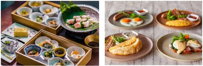 朝食は、5種の卵料理からお好みの1品をお選びいただくメインディッシュと、サイドメニューをブッフェでお召し上がりいただけるハーフブッフェスタイルの洋食をご提供いたします。