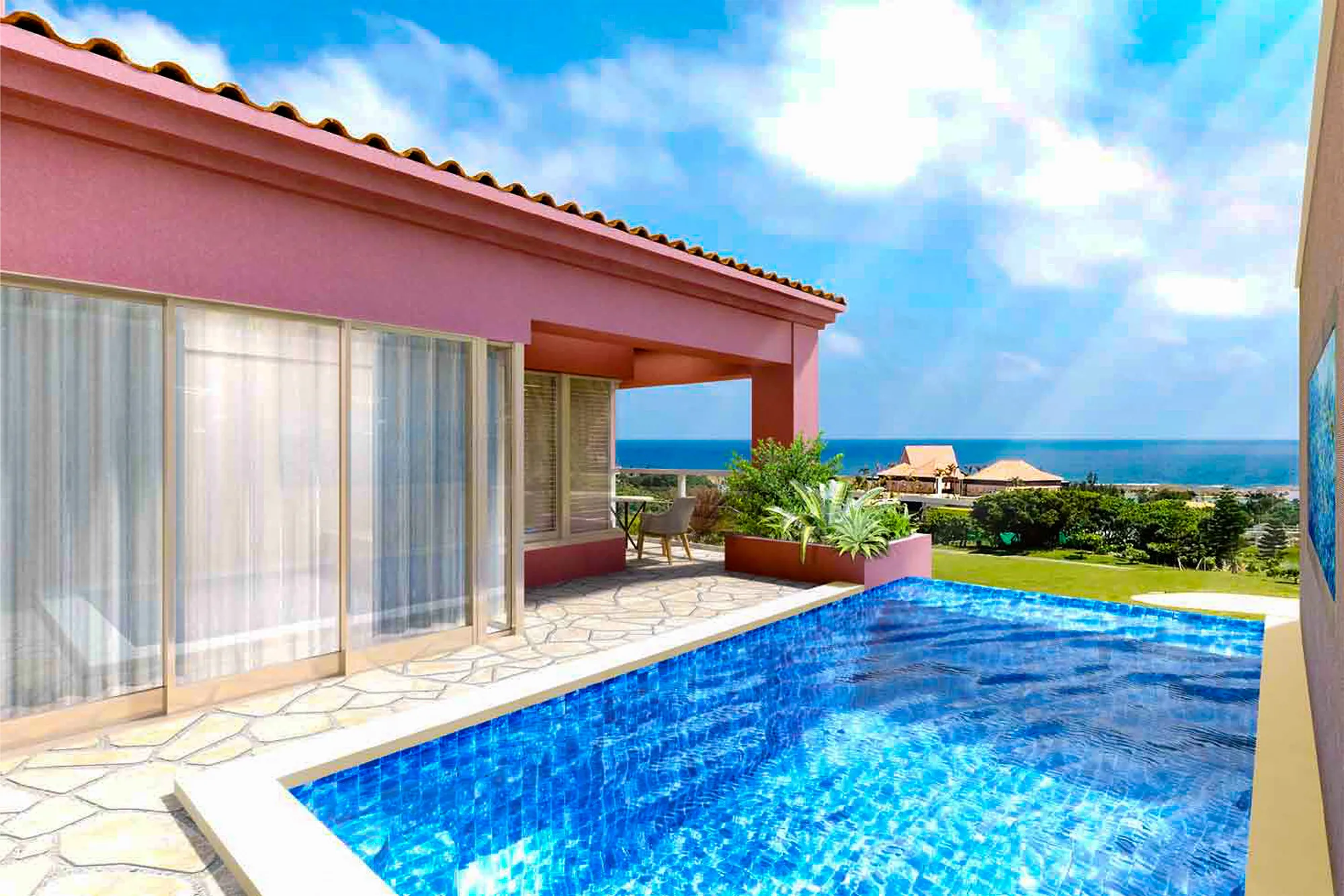 2・3階に位置するプールヴィラスイートメゾネットは、室内面積約130平米の贅沢な広さを誇るスイート。ベッドルームが上下階の両方に設けられ、ご家族や気心の知れたお仲間と快適にお過ごしいただけます。テラスに張り出したデイベットに横たわれば、まどろみの世界へと誘われ、広々としたテラスに広がるインフィニティプールからは、時間の流れとともに変化する宮古ブルーの景観を独り占めできます。