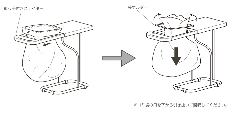 ②ゴミ袋を袋ホルダーから取り外して、ゴミ袋の口を下から引き抜いて回収してください。