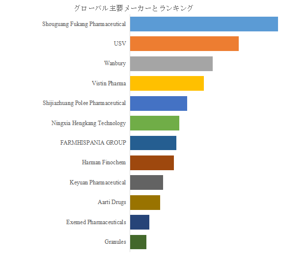 メトホルミン塩酸塩市場は、少数の大手企業が高い集中度で支配している。LP Informationのデータによれば、2024年時点で上位5社が世界売上シェアの約70%を占めている。主な企業には、Shouguang Fukang Pharmaceutical(寿光福康製薬)、USV、Wanbury、Vistin Pharma、Shijiazhuang Polee Pharmaceutical(石家荘博力製薬)、Ningxia Hengkang Technology、FARMHISPANIA GROUP、Harman Finochem、Keyuan Pharmaceutical、Aarti Drugsなどが挙げられる。