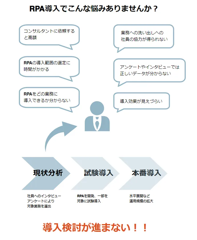 RPA適正診断はお客様の業務プロセスを効率的に収集し、現状分析でお困りのお客様に対して定量的な分析結果レポートをご提供することにより、繰り返し業務(=自動化対象)を可視化します。